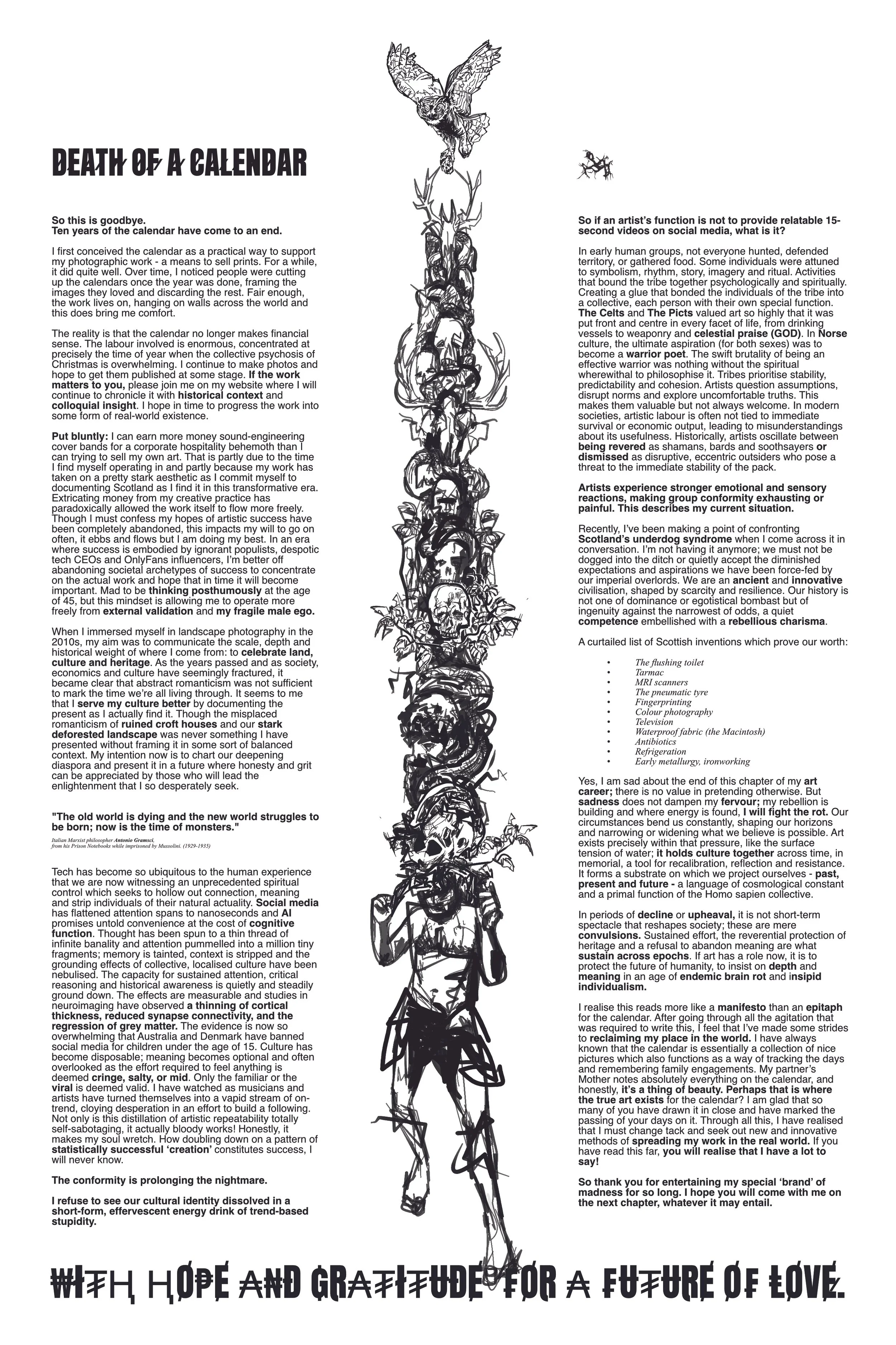 One of the major events in my art career has been killing the calendar project off after 10 years… Sad maybe but 100% needed, I must try and push my work into channels that fit it better instead of shoe horning it into a mass produced format that just doesn’t warrant such confrontational and lofty societal critique. People want to feel positive at New Year and lets face it the festive season is hardly a bastion of hard edged truth… The world spins on and I am hopeful that I can find ways to present my work in reality throughout the coming years. My full thoughts on the matter are presented below (↓)