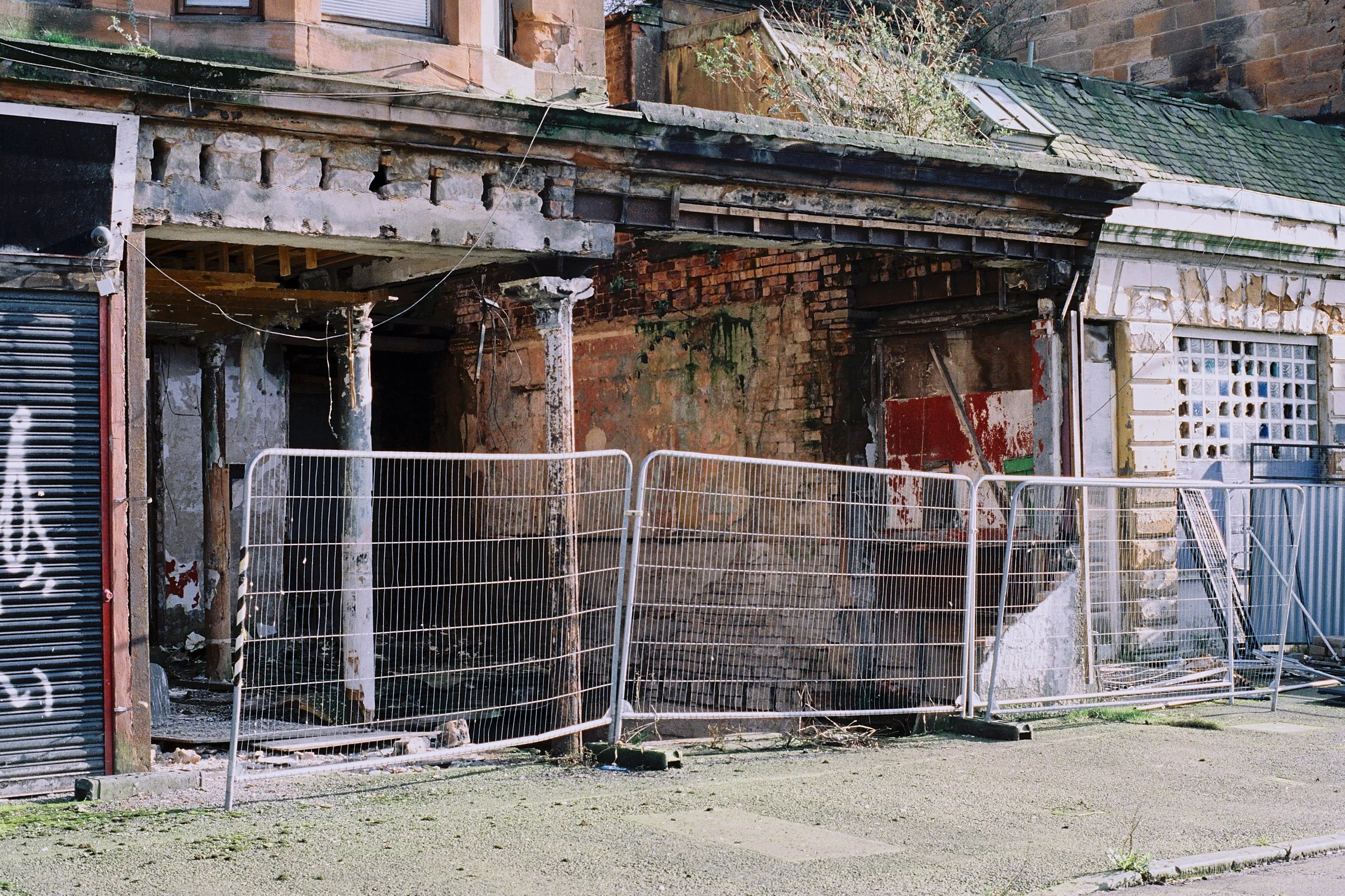 What’s left of John’s Bar after that big storm in October brought the long derelict pub down. Turns out that those 3, heavily corroded wrought iron pillars are all that was holding up the entire block. The block of tenements has been evacuated including the shop and the place has been fenced off like this for months. Not sure if they’re going to pull the whole block down including the tenements but it’s a demolition firm who’s details are posted on the fences. This of course brings up many questions over the ongoing safety problems surrounding derelict buildings everywhere. Glasgow is this most derelict I’ve seen it and I came here in 1998, it’s pretty amazing that nobody knew about this structural short coming until the pub caved in. Clearly these three pillars are not designed to bear the weight of an entire block of sandstone tenements. Though they still are!