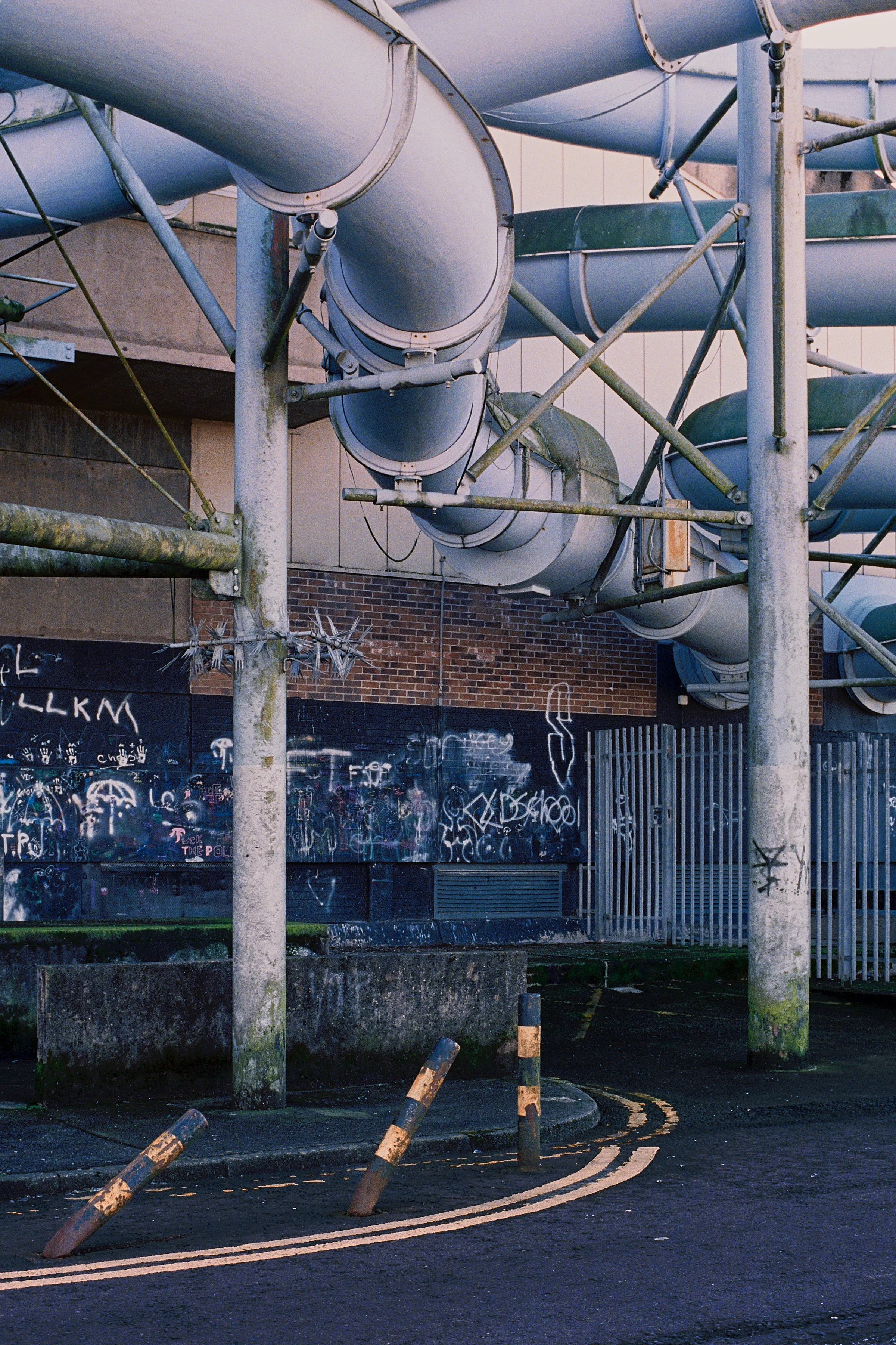 The north wall of the Dollan Aqua Centre and it’s defunct and structurally unsound flume. Been taking photos here for years. Sad to see racist and fascist graffiti here for the first time. I’ve written before about the bend in these bollards, pretty sure it’s intentional and an ongoing project of the youths around here.