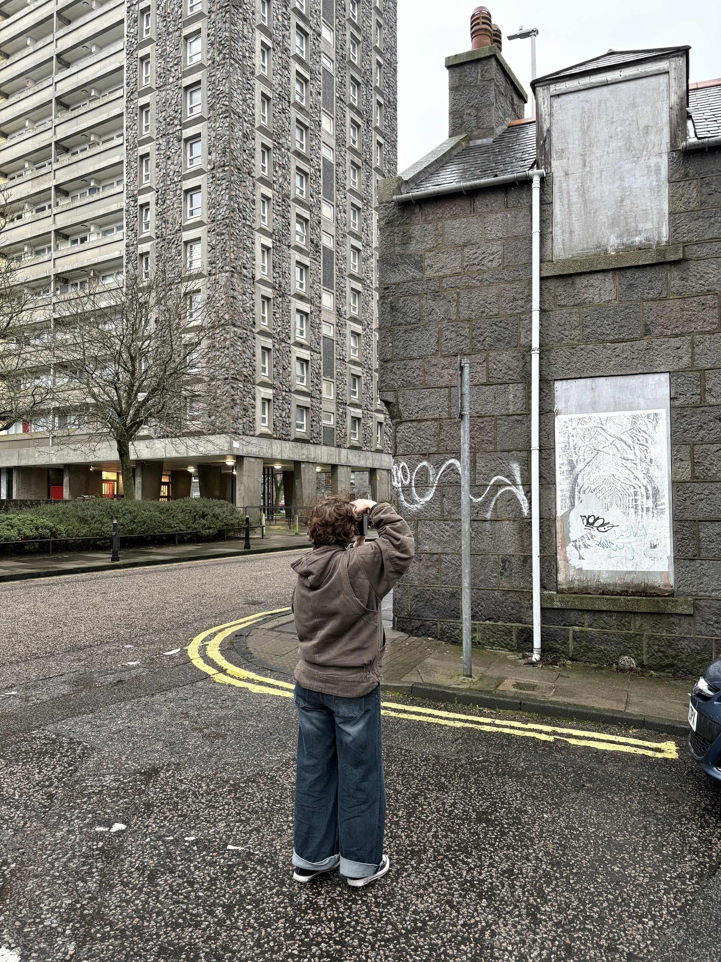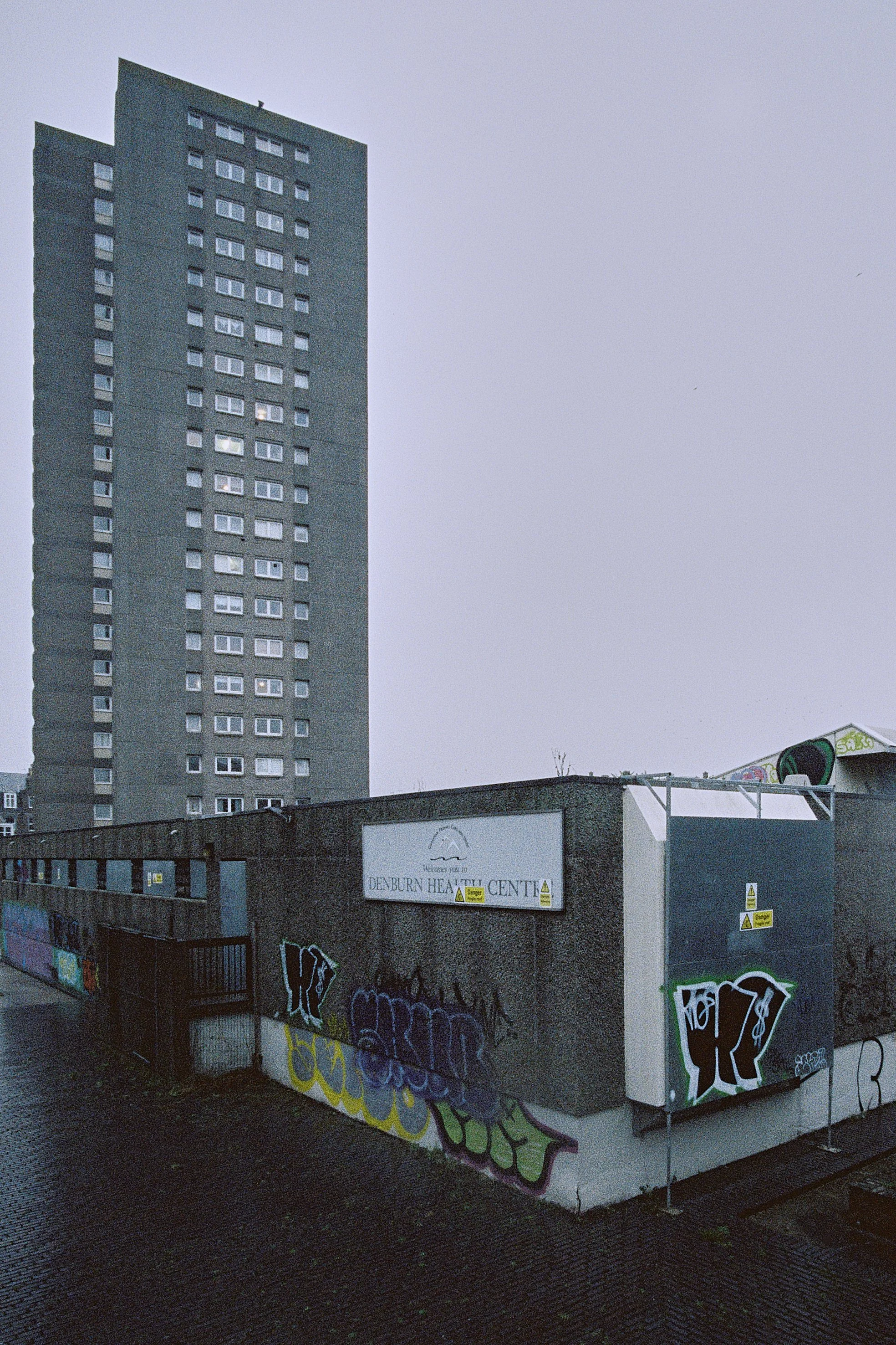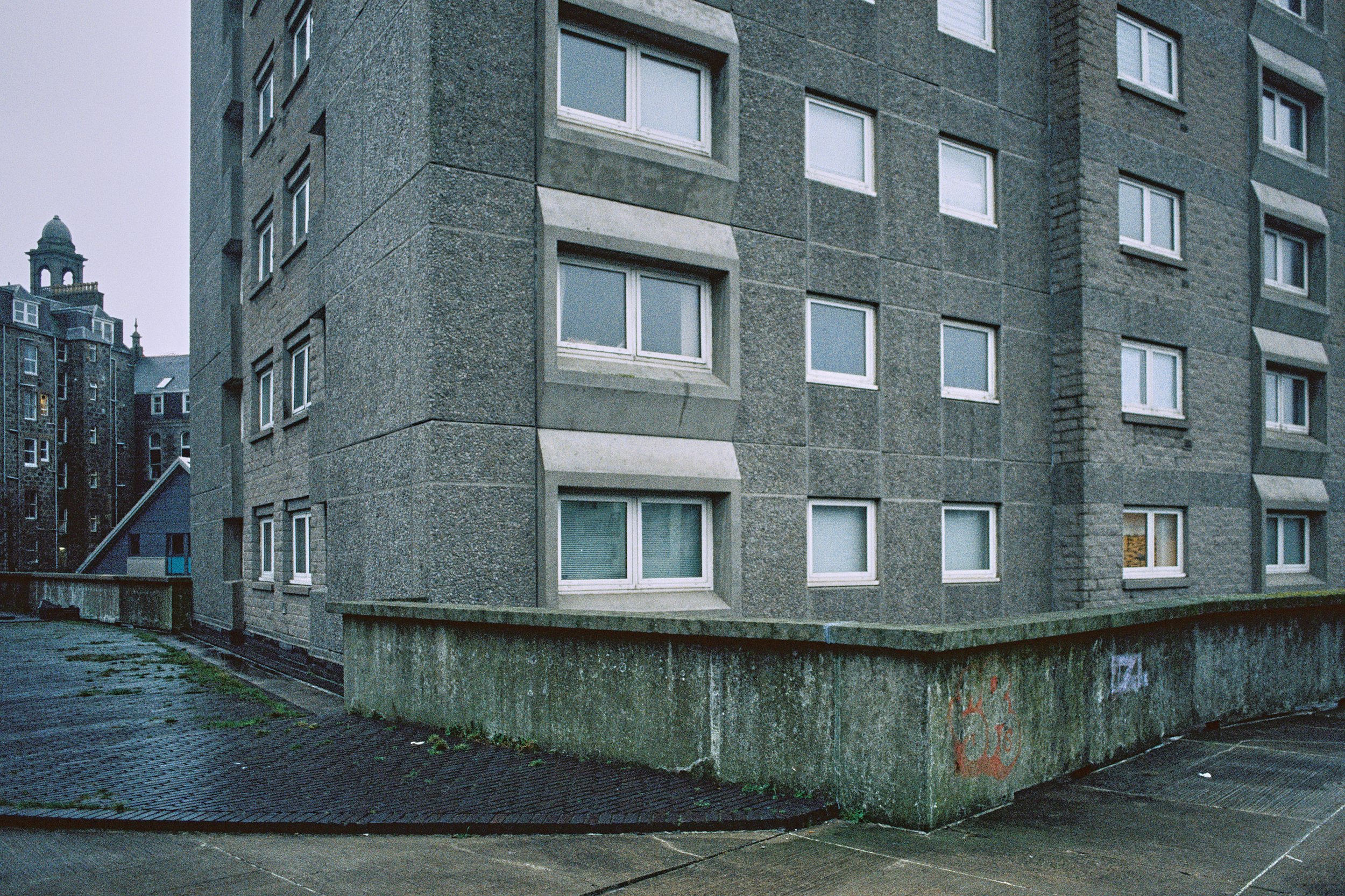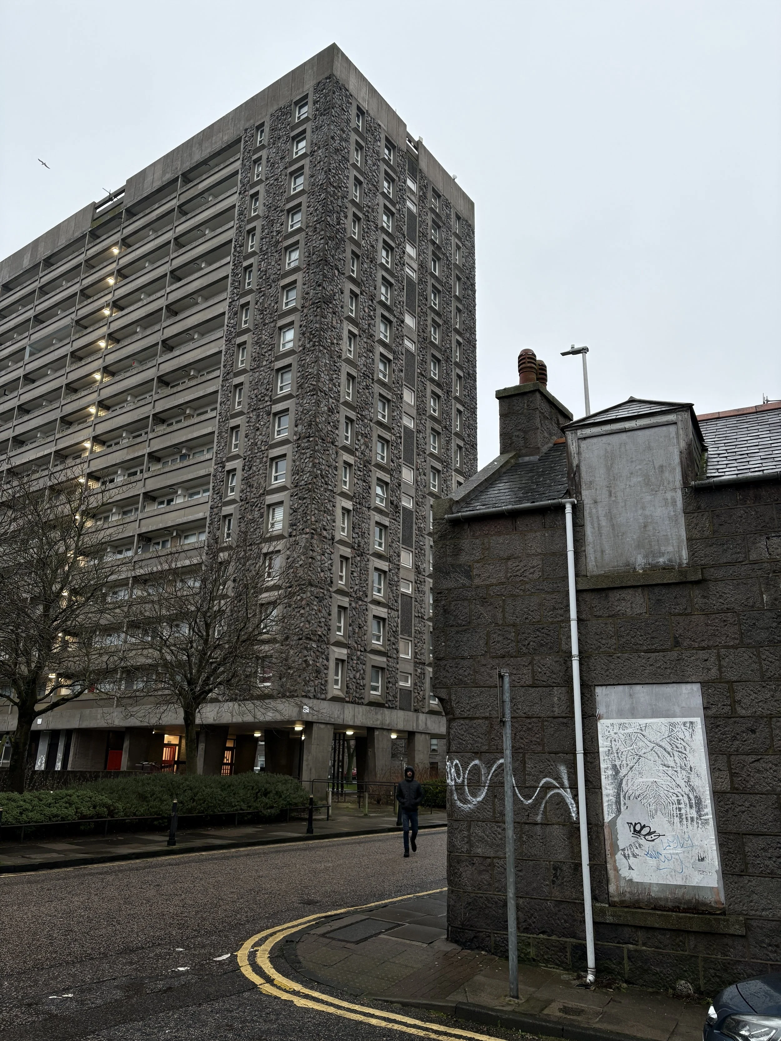 This brutalist megastructure just north west of the city centre has ended up in a strange sort of limbo due to ‘Reinforced Autoclaved Aerated Concrete’ (RAAC) and Asbestos. Meaning that the health centre on the top deck is now unsafe and has been abandoned since 2023. The google reviews for the Denburn Health Centre are pretty stark, you can read them here. The Denburn Carpark and Denburn Court, the 22 storey tower block you see here were built in 1971-73 replacing the granite tenements , workshops and railway infrastructure that existed here for over 200 years. Classed as a slum and not fit for human habitation in the 1960s the area was mostly demolished. This repository of photos and documents on Trove.scot give loads of insight to the place, past and present. The Denburn Car Park is still operable and apparently folk are running QR code scams in it.