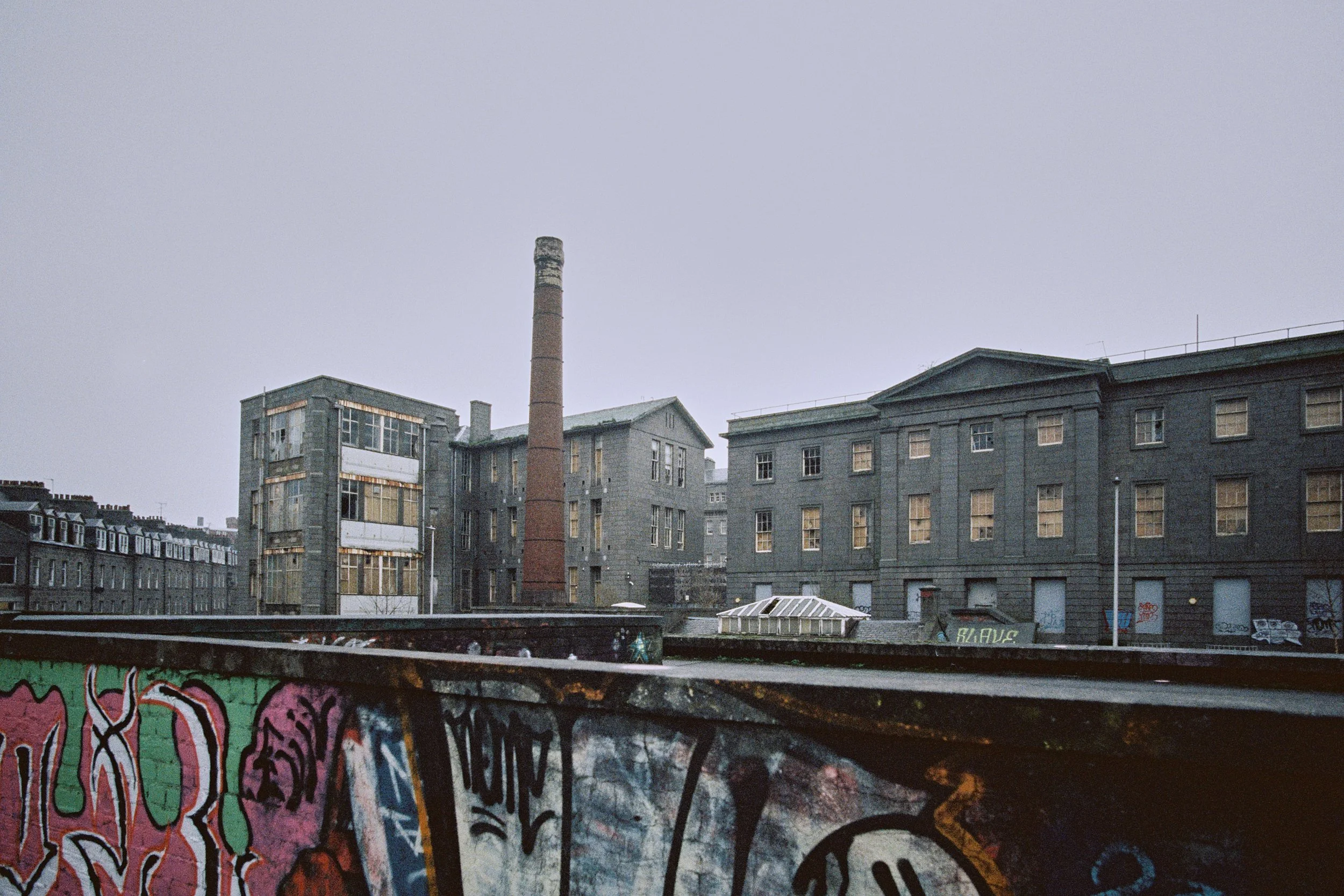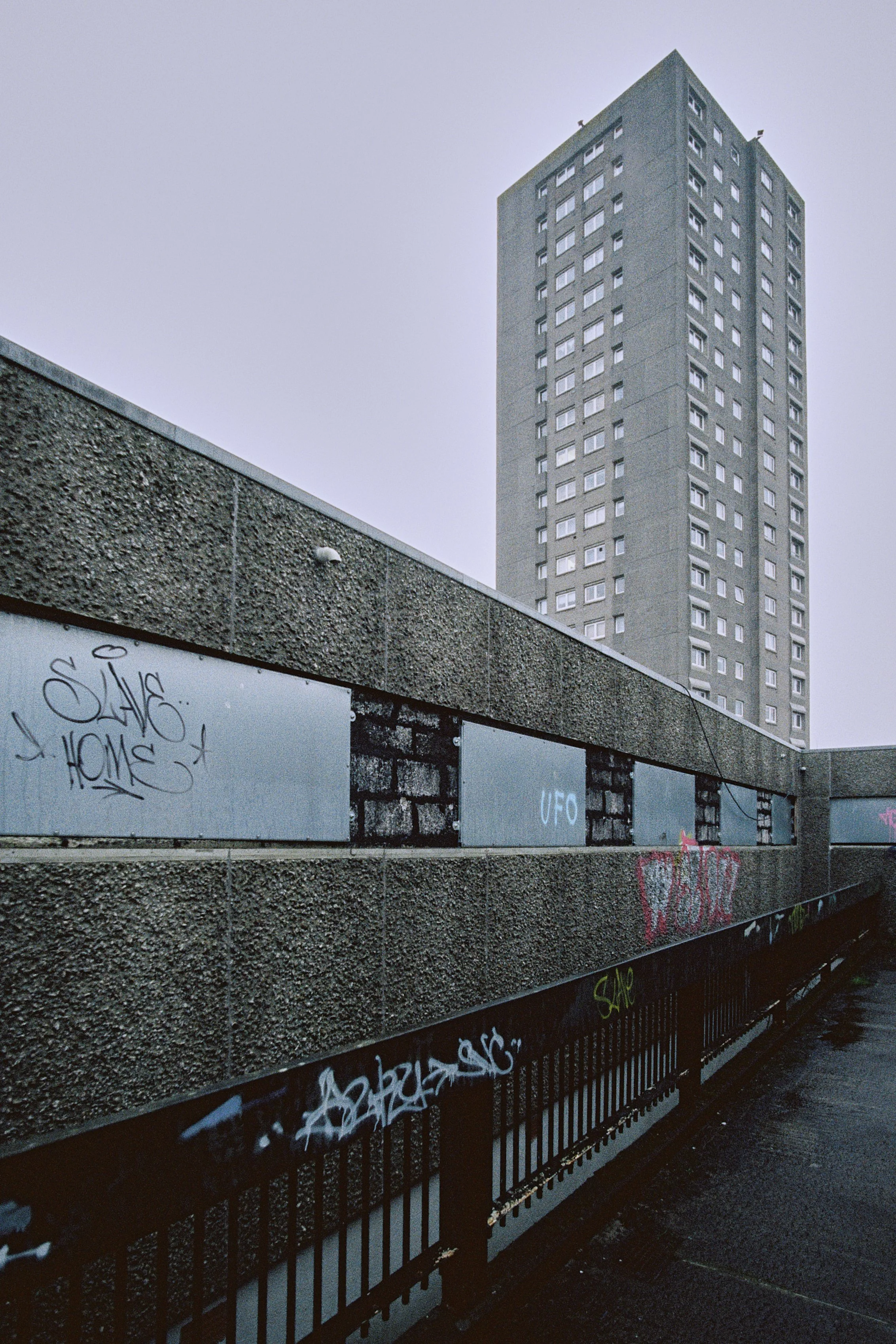 The last shot on the film and just sublime, the soft light on the bevelled stilts, the glow from the boiler room, the dank on the pavement, the lichen and the moss. Denburn swathed in mizzling rain on the horizon. This frame shows a big handling scratch and the edge of a bit of tape, these will have been made by the people re-spooling the film, I think these artefacts absolutely enhance this photo. I will definitely be back in Aberdeen soon and hopefully it coincides with the Skaters of Denburn doing a clean up, because I wanna volunteer and sample their craic, i think they are so inspiring.