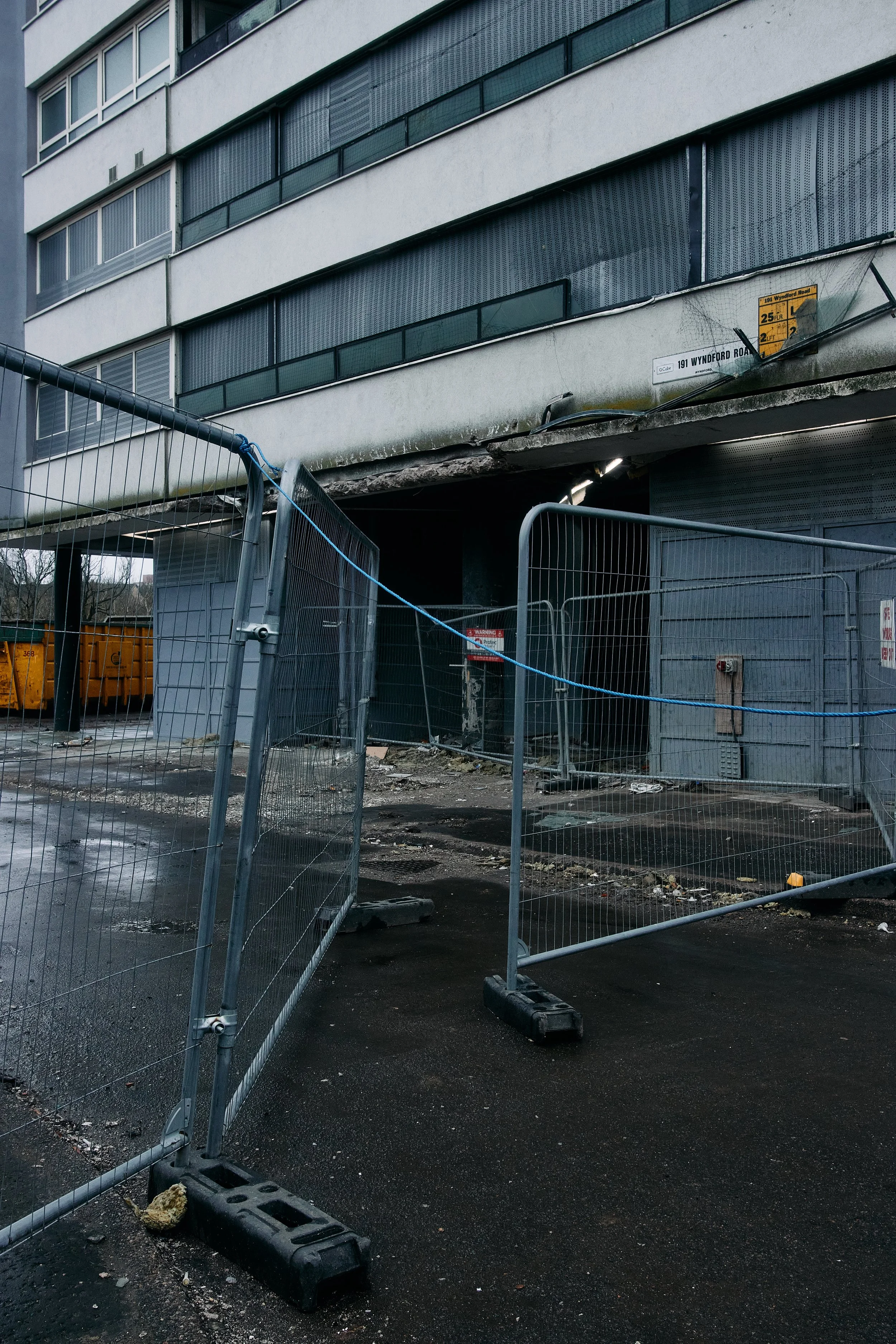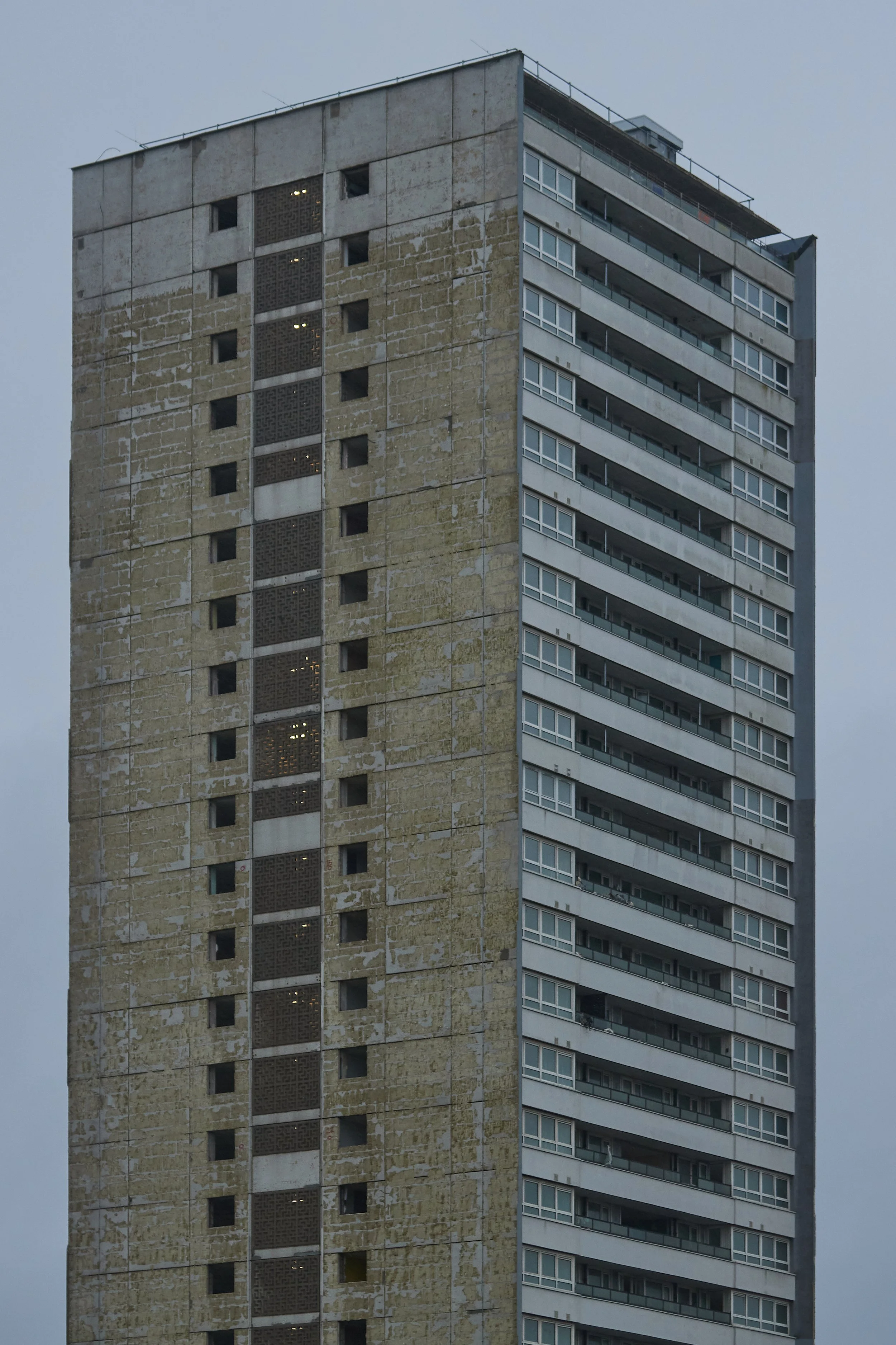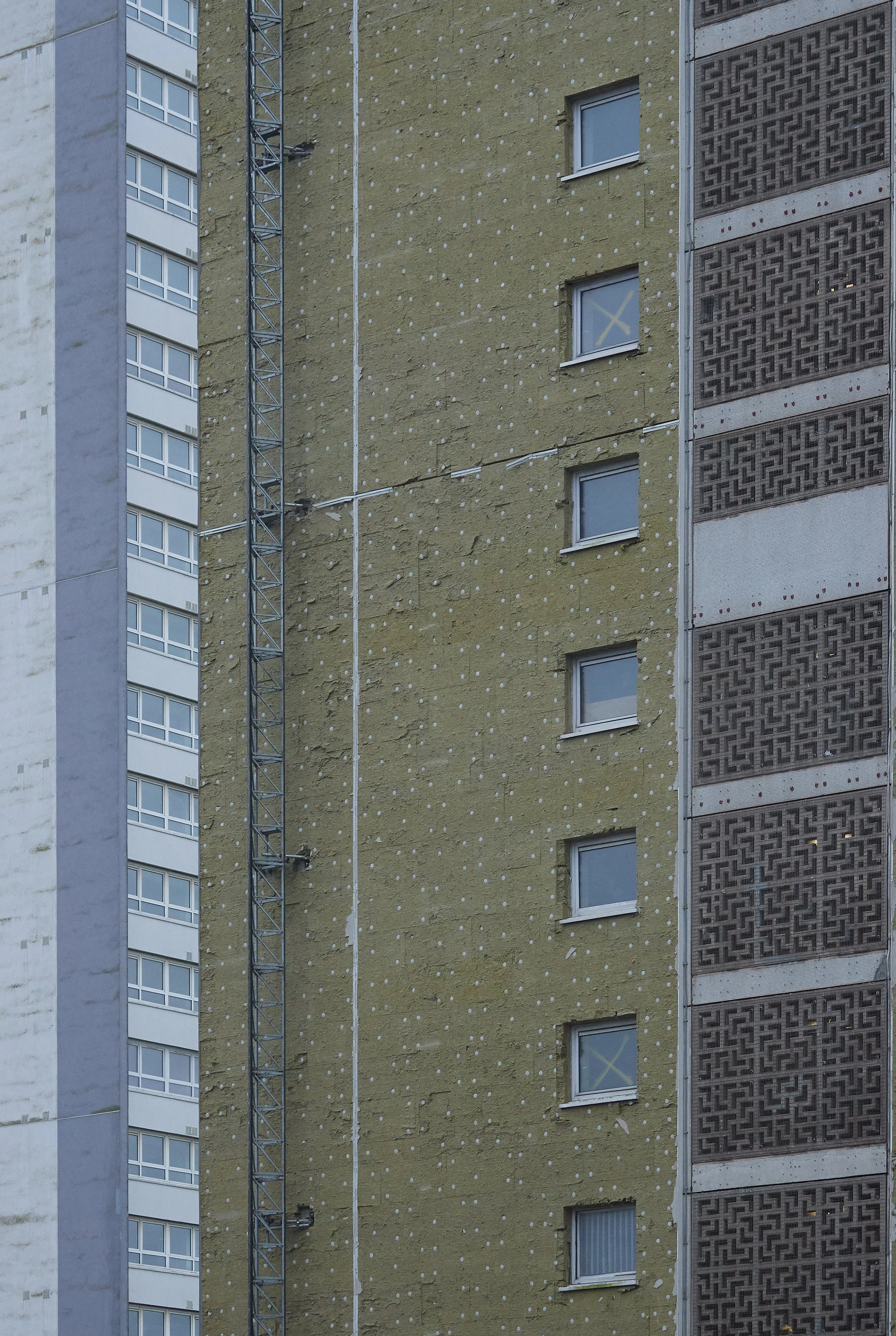 Details of the stairwell patterning, plus the insulation that was under the cladding before it was stripped off 171. The truss for the gantries that the stripping team used to chisel it all off are also visible, 191 in the background was yet to undergo the stripping out process. January 2024.