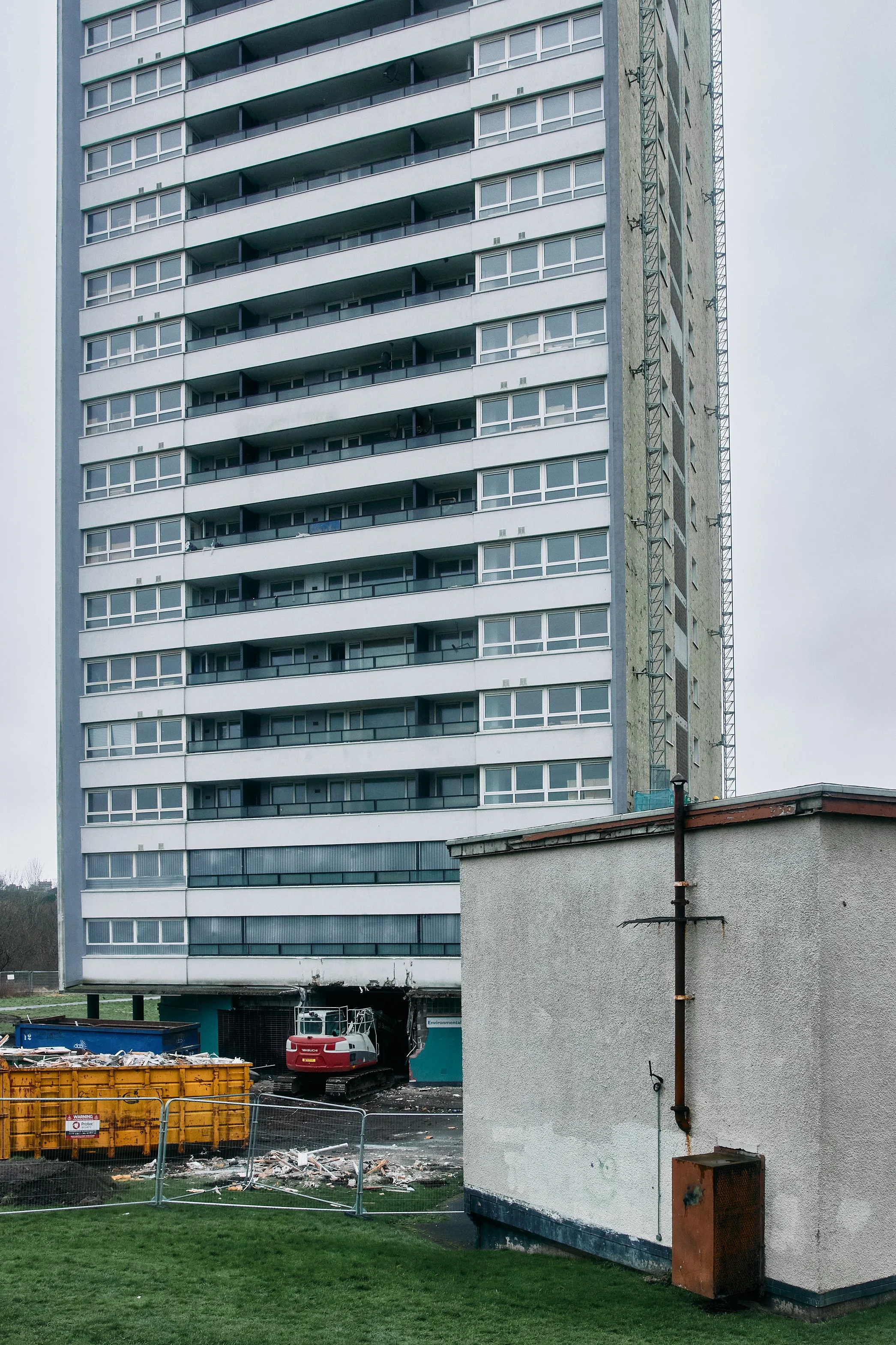 Spring 2023 - You can see netting on the base of the tower which was collecting decaying cladding that was falling off.